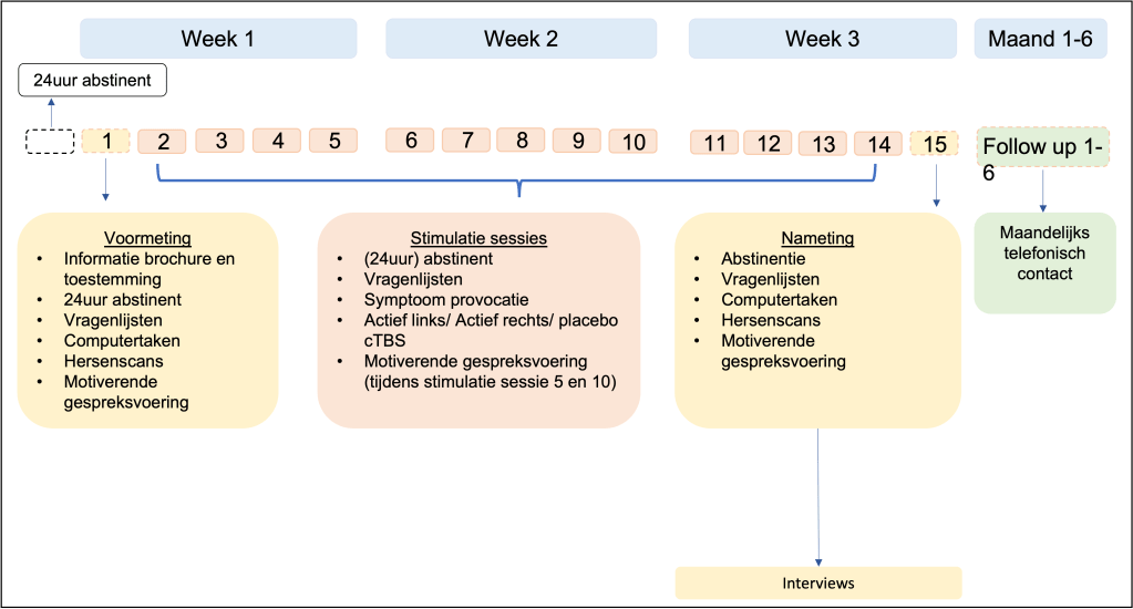 Deelname aan dit onderzoek duurt 3 weken, gevolgd door een aantal telefonische contactmomenten. U begint thuis met het invullen van en online vragenlijst om te kijken of u in aanmerking komt om mee te doen aan dit onderzoek. Wanneer u mee kunt doen met het onderzoek wordt er een afspraak gemaakt wanneer u gaat beginnen met het onderzoek. U mag 24 uur voorafgaand aan de eerste sessie geen sigaretten roken, alcohol drinken of drugs gebruiken. Tijdens de eerste sessie zult u nog meer vragenlijsten invullen, een aantal computertaken uitvoeren en in de MRI scanner gaan voor een aantal hersenscans. Tijdens de volgende 13 sessies zult u een korte hersenstimulatie ondergaan. De sessies duren ieder een uur, maar de stimulatie zelf duurt 20 seconde. Vervolgens is er een nameting, waarbij u weer vragenlijsten zult invullen, computertaken gaat uitvoeren en in de MRI scanner gaat. In totaal komt u dus over een periode van 3 weken 15 keer naar de onderzoekslocatie. Na deze sessie nemen we tot 6 maanden na afloop maandelijks contact met u op met een aantal vragen over uw rookgedrag. Ook wordt u na afloop van het onderzoek uitgenodigd voor een interview over uw deelname en ideeën over toekomstig onderzoek.